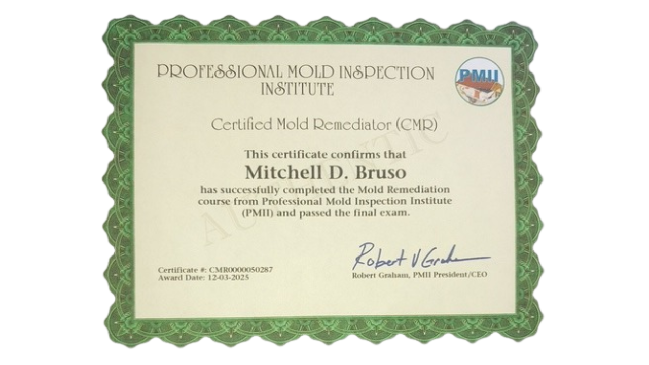 At Blue Water Restoration, your health and safety are our top priority. That’s why our lead specialist is a Certified Mold Remediator through the Professional Mold Inspection Institute (PMII) — a nationally respected certification program.